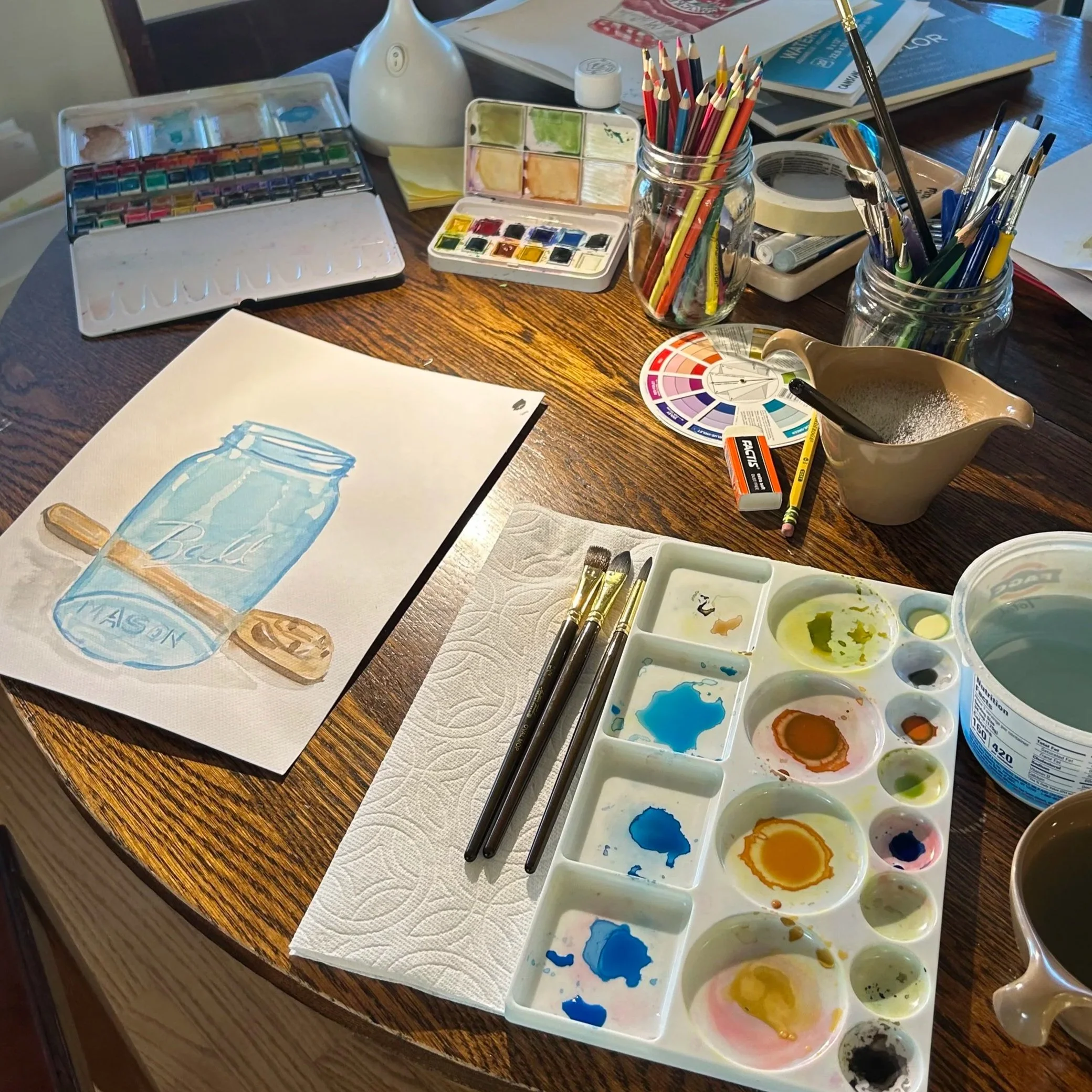 This isn’t a traditional studio. My paints, brushes, palettes and paper fill the kitchen table. From my chair these books and illustrations come to life. What I love most about watercolor is how simple the materials are. A small set of paints, a brush, a cup of water, and a piece of paper are enough to begin. I started painting with Crayola watercolors from Walmart, and a couple brushes. Art doesn’t need a special studio or perfect conditions. A kitchen table, a quiet afternoon, or even a quick color swatch or inso pic between everyday tasks can become the start of a painting.